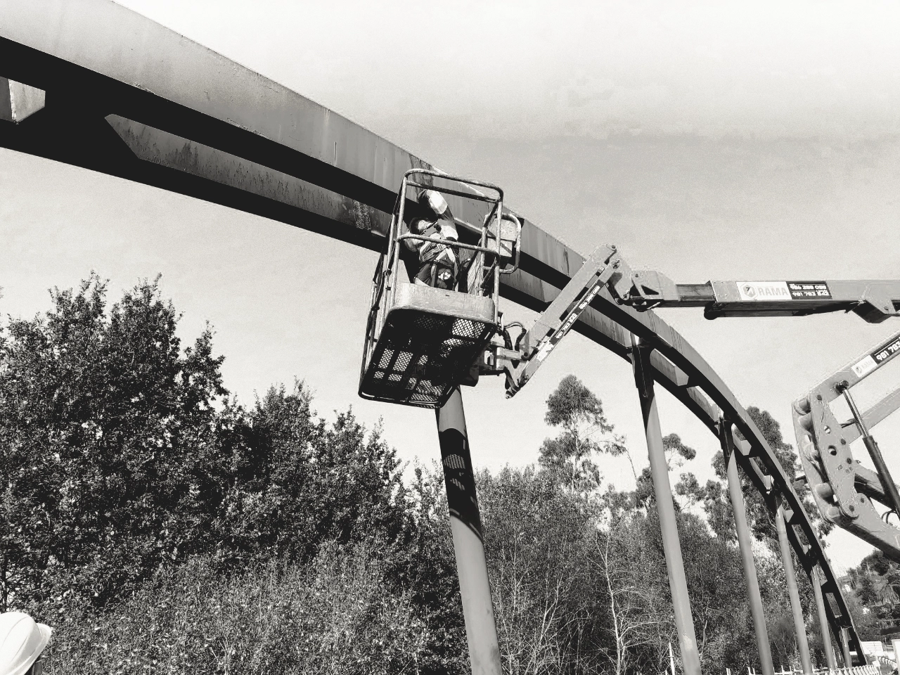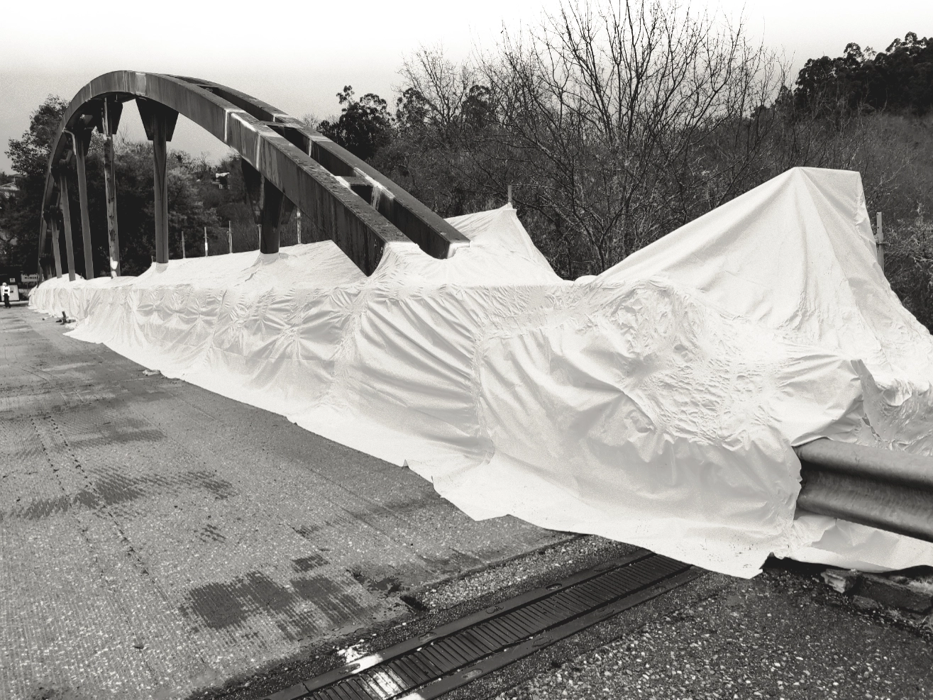 Lower scaffolding was installed along the entire length of the structure to carry out underside repairs and painting works. The structure was protected with tarpaulins to prevent environmental contamination and pollution of the riverbed.